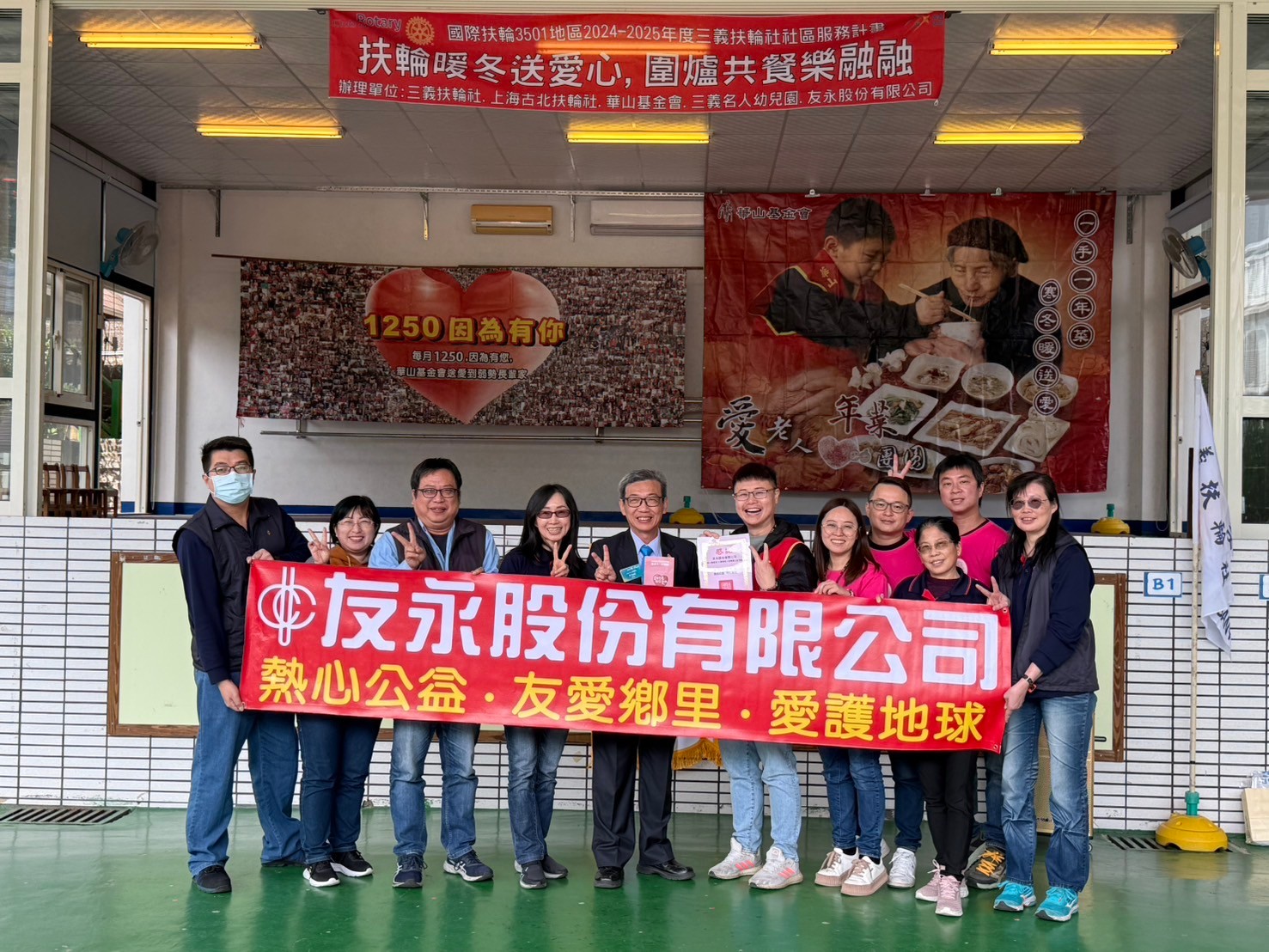 本著熱愛鄉里、回饋社會的理念,友永公司與華山基金會結合三義扶輪社在名人幼兒園進行認購愛心年菜、大夥扶老攜幼特別與獨居長輩提早一起圍爐!希望拋磚引玉、讓社會更美好!大家更幸福!
